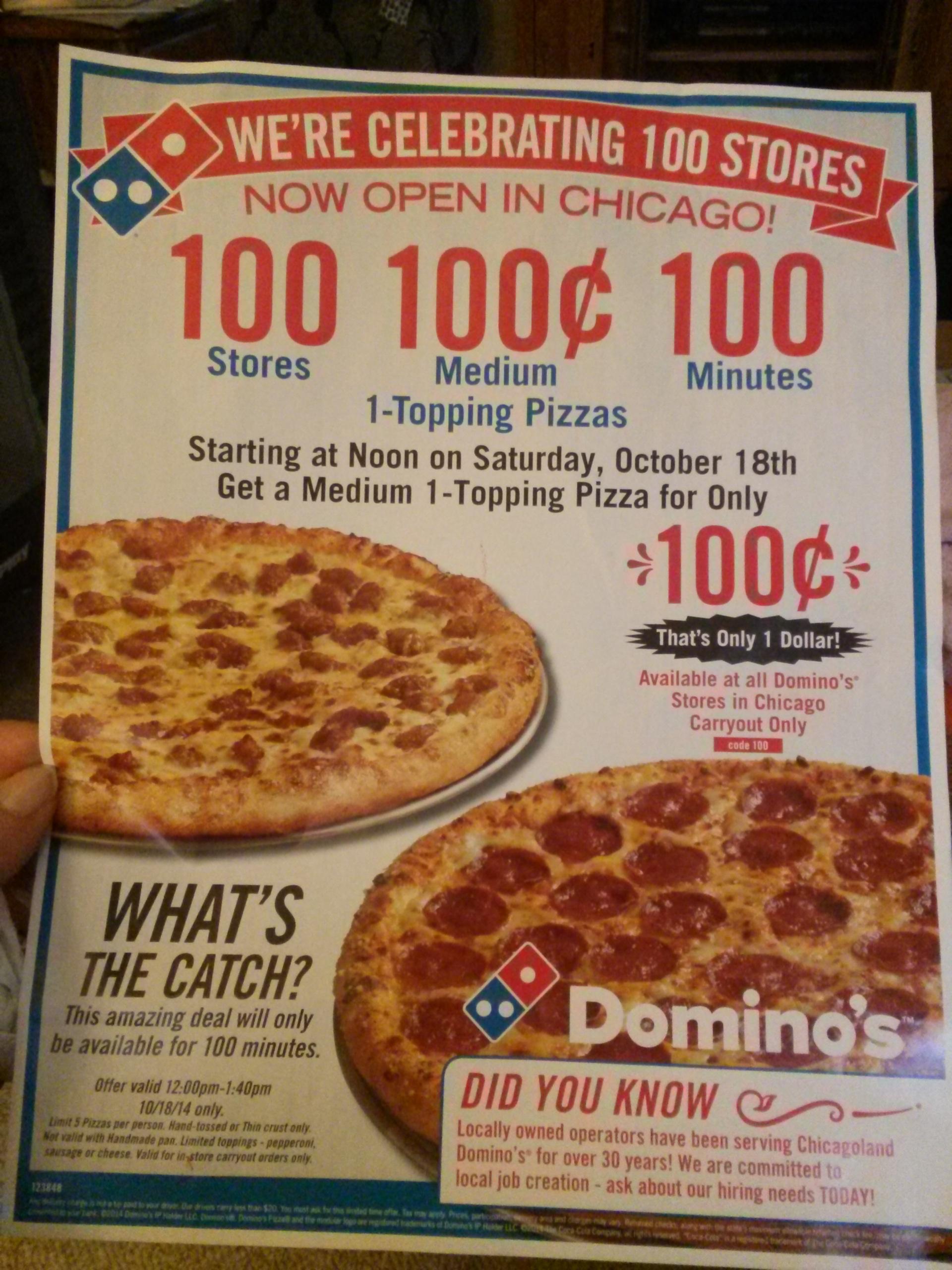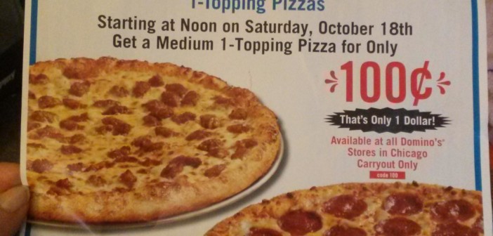 In honor of their 100th store opening, Dominos Pizza is offering medium one-topping pizzas for 100 cents, but only for 100 minutes! From noon till 1:40pm, all Chicago Dominos locations will be offering medium pizzas for only $1. Apparently each person can order up to 5 pizzas at a time… Now, any self-respecting Chicagoan would never turn to Dominos to satisfy their pizza cravings, but for only a dollar for a whole pizza, we will let it slide this time.