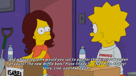 Bart: And what programs would you cut to pay for this precious garden of yours? The new Wiffle bats? Pizza Friday?